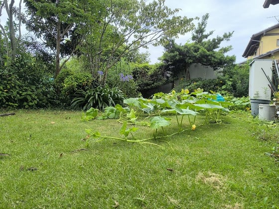 小さな畑に設置したコンポストの場所を移動した際に数年前のカボチャの種が目を覚まし、発芽し芝生ゾーンに侵食してきました。朝、起きて庭に目をやり、雄花と雌花の開花を確認し、受粉作業をするハチのような仕事が朝の楽しみでした。